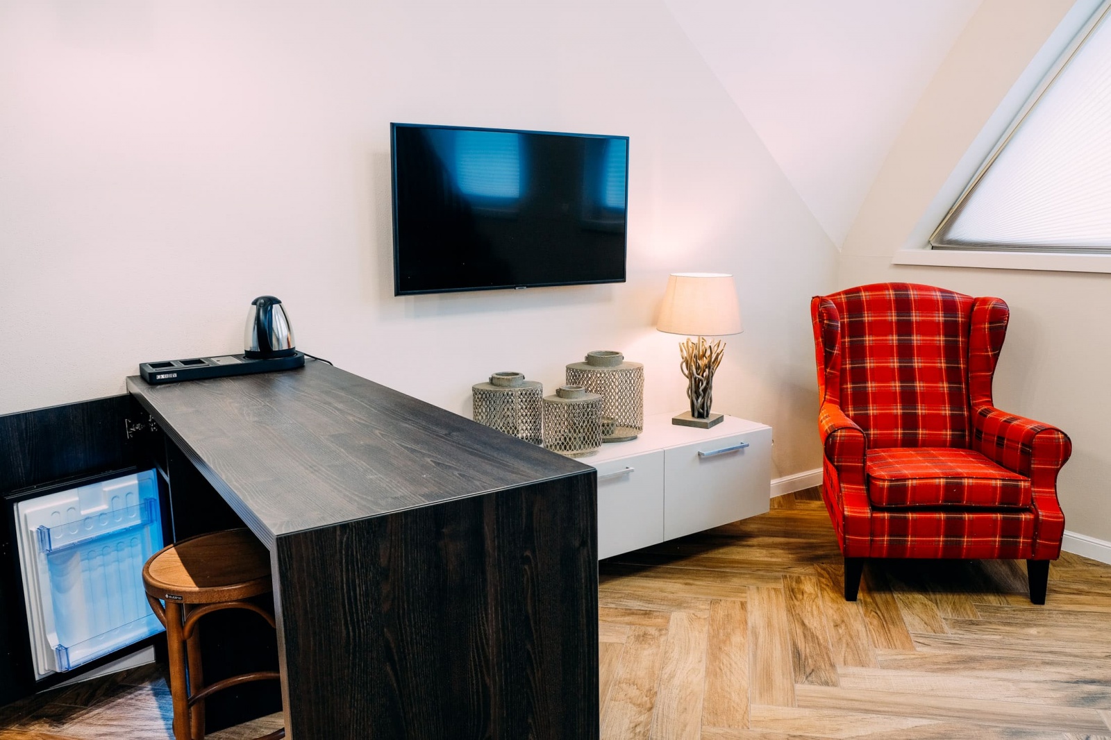 Pri vstupe do apartmánu nájdete obývaciu miestnosť s gaučom, TV, pracovným stolom, vstavanou skriňou s vešiakmi, chladničkou, trezorom na osobné veci a samostatným WC. Z obývacej časti s vysokým stropom vedú schody do spálne loftového typu vybavenej manželskou posteľou, pracovným stolom a TV. Elektrické zásuvky potrebné na nabíjanie mobilných zariadení sú v blízkosti nočných stolíkov. Vysoký strop prepája obývaciu časť a časť určenú na spanie.