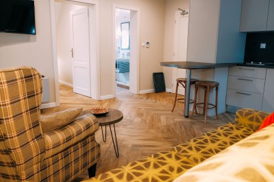 Vstupná izba apartmánu je vybavená gaučom, kreslom, TV, stolíkom, chladničkou, vstavanej skrine s vešiakmi a trezoru na osobné veci. Vedľajšia izba - spálňa - je vybavená manželskou posteľou a TV. Elektrické zásuvky potrebné na nabíjanie mobilných zariadení sú v blízkosti nočných stolíkov. Apartmán dopĺňa priestranná kúpeľňa so sprchovým kútom a WC, uterákmi a fénom. V izbe sa pripojíte sa na WIFI.